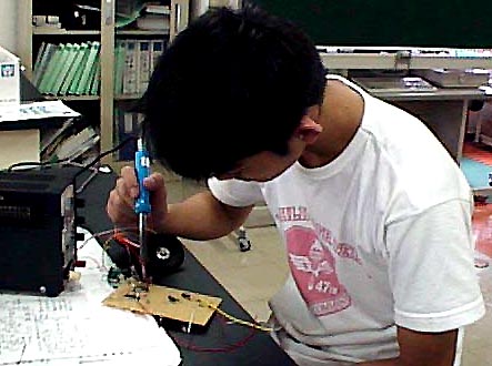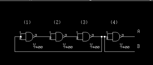 まず(1)の回路に1を入力する。するとNOT回路 なので出力は0となる。次に(2)の回路に0が入 力される。すると(3)もNOT回路なので同じよう に出力が1となる。次に(3)からの出力が(1) に戻り、今の説明の逆となる。この時(3)からの 出力が(4)にも流れる。この時、時間差が生じる ため、出力1と0が交互に流れるのだ!! おわかり? 下図の写真は実習中の私の苦戦している姿です。